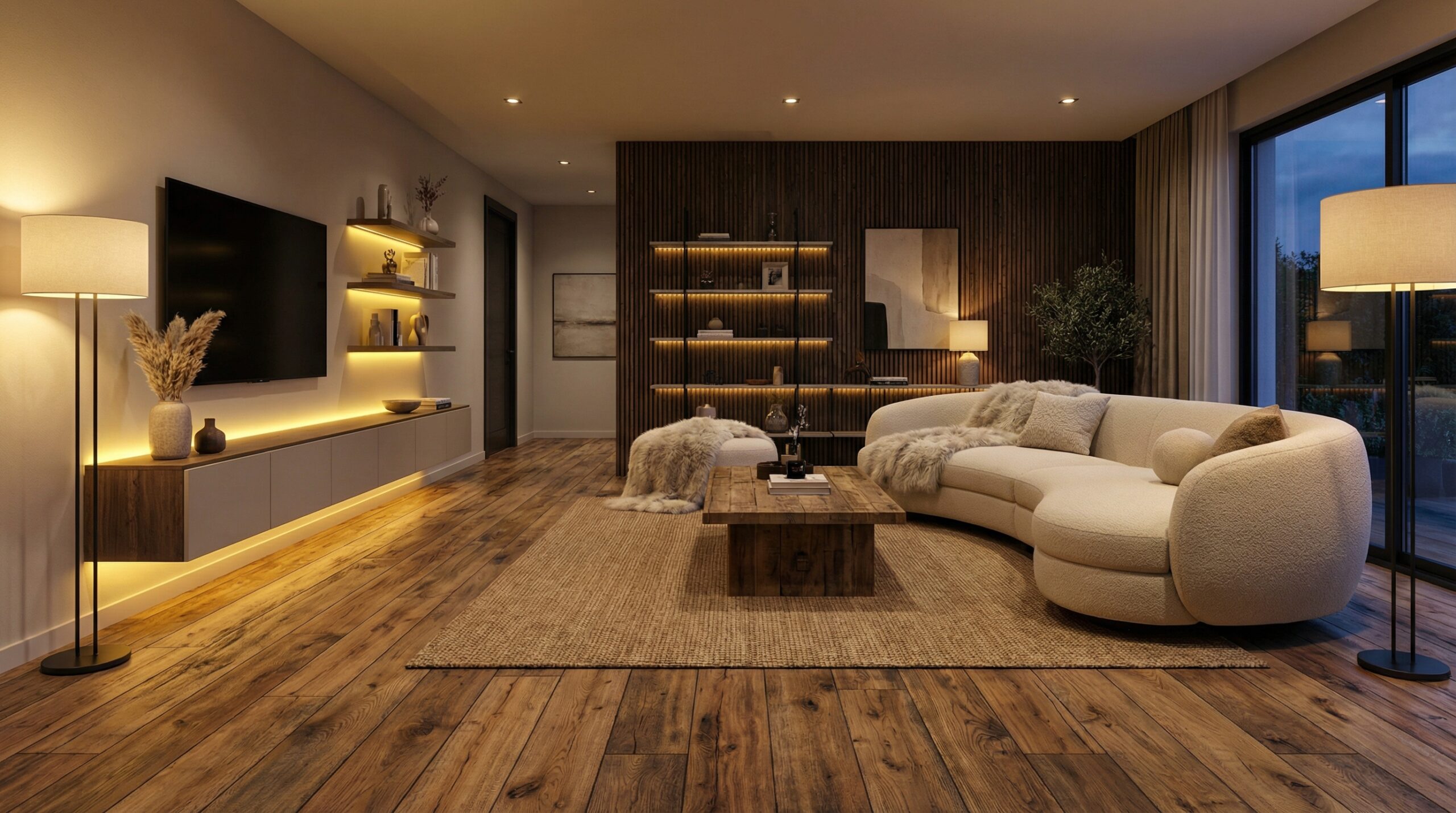 Ánh sáng vàng (2700K – 3000K) là lựa chọn lý tưởng cho các không gian sử dụng sàn gỗ công nghiệp. Khi kết hợp đúng cách, ánh sáng này sẽ: